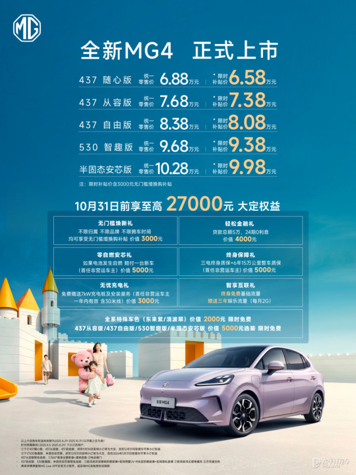作为了解,MG4在2025成都车展上市,共推出5款车型,统一零售价6.88-10.28万元。新车提供437km和530km两种续航,搭载MG X OPPO智行车机互联系统。